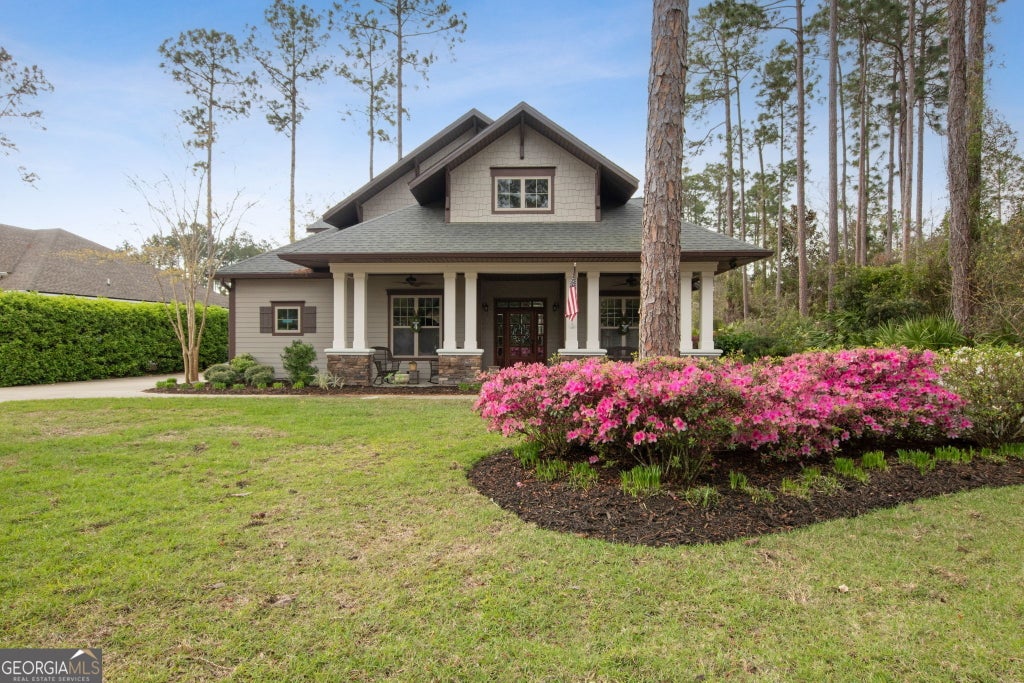 Charm awaits you at 115 Angler Lane! If you can get past the welcoming front porch, you'll love the character within, boasting hardwood floors, plantation shutters, a beautiful foyer and extra details throughout. A formal dining room will take you into the kitchen where you'll find a built-in dining table and an eat-up bar with custom cabinetry and granite counters. The cozy living room with vaulted ceilings and a gas (propane), stone-surround fireplace, built-in bookshelves and dry bar will make you feel right at home! It get's even better.. open up to the back screened lanai and enjoy the tranquility of an evening overlooking the pond. There is also an open area off the screened porch to enjoy for grilling. A large primary bedroom and bathroom are located downstairs and then an additional 3 bedrooms are upstairs with a second bath. Call to preview this dreamy home!