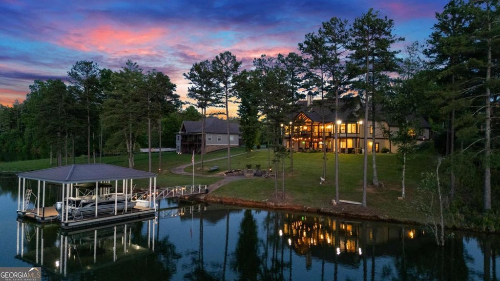 Set against the breathtaking backdrop of Lake Nottely and the Blue Ridge Mountains, this masterfully crafted 4-bedroom, 4-bathroom home is a standout residence within the prestigious gated community of The Grove at Highland Park in Blairsville, GA. Designed to capture sweeping lake and mountain views, the main level features an open layout with vaulted tongue-and-groove ceilings, exposed beams, a dramatic stacked-stone fireplace, and a wall of windows that flood the space with natural light. The gourmet kitchen boasts granite countertops, high-end stainless steel appliances, a gas cooktop, walk-in pantry, and a stylish dining area ideal for entertaining. A private office with a full bath offers flexible use as a home office or additional bedroom suite. The owner's suite is a serene retreat with lake views and a spa-inspired bathroom featuring a garden tub, dual vanities, and a glass-and-tile walk-in shower. Step outside to a covered deck overlooking the water, perfect for relaxing and enjoying the scenery. The terrace level offers a fully independent living space with a second kitchen, laundry room, three bedrooms, two bathrooms, a cozy living area with fireplace, and a spacious game room. Glass doors open to a covered patio and private hot tub with tranquil lake views. Outdoor living is enhanced by professionally landscaped grounds, a stone fire pit by the shore, and a private golf cart path leading to a 2-slip covered dock with boat lifts and swim platform. Residents enjoy luxury amenities including a clubhouse with infinity pool, fitness center, theater, pub/game room, grilling stations, boat parking, and expansive lakeview decks. Combining elegant design, thoughtful features, and stunning natural surroundings, this exceptional home offers an unparalleled lifestyle in North Georgia.