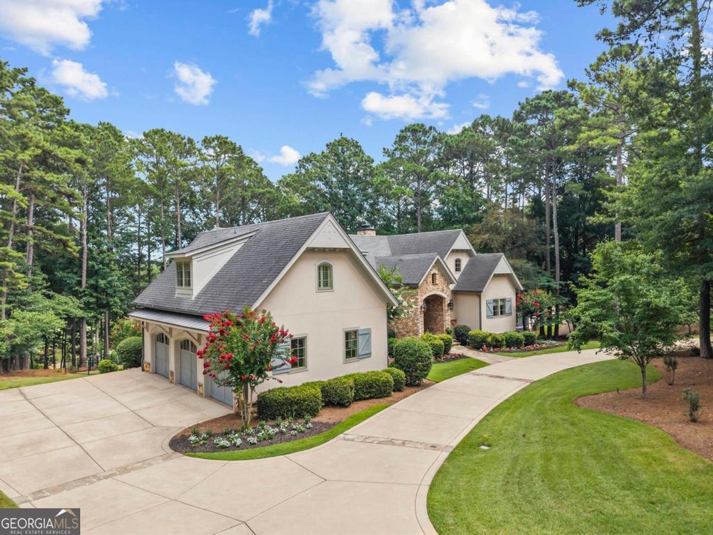 ELEGANT DREAMBUILT ESTATE ON A PREMIER DOUBLE LOT OVERLOOKING THE SIGNATURE 12TH HOLE OF THE OCONEE COURSE WITH A LARGE FENCED BACKYARD AND ROOM FOR A POOL. Nestled on 1.37 acres with a spacious circular driveway and 3 car side entry garage, this custom designed home offers timeless, quality craftsmanship, and breathtaking golf views. This classic French Country estate features 4 bedrooms and a dedicated office with easy potential for conversion to a 5th bedroom, along with 3 and a half baths. The exterior showcases timeless architecture with stone and stucco finishes, a custom solid mahogany front door flanked by gas lanterns, and a soaring two story foyer that opens to an inviting open concept layout designed for the entertainer at heart. The main level great room features beamed ceilings and a floor to ceiling stone fireplace. Triple French doors open to a covered deck overlooking the green of the 12th hole. A built-in wet bar with custom cabinetry, dual lighting, wine fridge, and sink creates a seamless space for hosting. The great room flows into the chef's kitchen, which features a 48 inch Wolf dual fuel range, SubZero side by side refrigerator, Cove dishwasher, custom wood and stucco range hood, and cabinetry with glass transoms and iron accents. A double height granite island anchors the space, while a walkthrough pantry provides built in shelving and extra counterspace. The adjacent prep kitchen includes a second sink, room for a coffee station, and ample space for catering. A custom built in two sided buffet connects the kitchen to the two story dining room, surrounded by windows and filled with natural light, making it an ideal setting for entertaining. The primary suite offers coffered ceilings and French door access to the deck, perfect for quiet mornings and tranquil golf views. The spa like bath features dual water closets, heated floors, soaking tub, walk in shower, a large custom closet, and direct access to the nearby laundry room. Upstairs, a spacious bonus suite includes a sitting area, full bath, room for two queen beds, and a showroom style closet. The terrace level features a second family room, walk out patio, gym, 2 bedrooms with shared bath and separate vanities, and an office with its own exterior access, ideal as a private workspace or potential guest suite. The fenced backyard includes stone walkways, landscape lighting, and room for a future pool. Minutes from the Lake Club, Ritz Carlton, and Creek Club. Membership available.