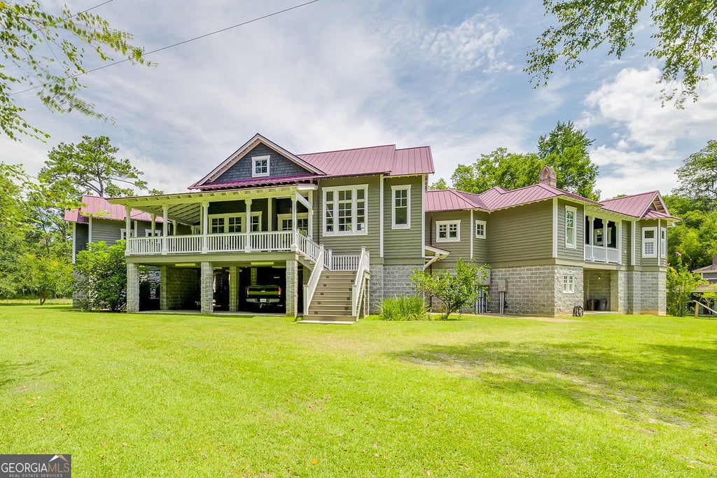 Experience the ultimate in riverfront living with this remarkable estate located on the peaceful banks of the Ogeechee River in Brooklet, Georgia. Thoughtfully designed with impeccable craftsmanship, this home features an expansive open layout with soaring cathedral ceilings, a formal dining room, a spacious great room, a gourmet kitchen, a private office, and two elegant Master Suites. Premium finishes include gorgeous hardwood floors, pecky cypress paneling, quartz countertops, and other refined details throughout. The lower level adds even more versatility with a second kitchen, comfortable living area, half bath, workroom, and a large walk-in pantry-perfect for hosting or multigenerational living. Step outside to relax in the hot tub or spa while soaking in panoramic river views. Entertain with ease in the outdoor kitchen, ideal for backyard barbecues and gatherings. A private dock offers direct access to the river, where the fishing is exceptional. With over 4,500 square feet of living space and 9,056 square feet under roof, this home is perfectly suited for entertaining and creating cherished memories with family and friends. Truly a rare gem, this private retreat offers peace, privacy, and the beauty of nature.
