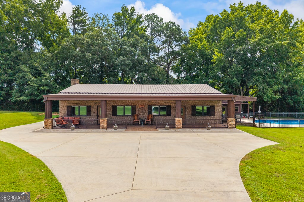 Stunning 2-bedroom, 1.5-bath custom barndominium situated on 5 acres in the quiet countryside of Pike County. his well-appointed home offers 1,150 sq.ft. of thoughtfully designed living room space, featuring high ceilings and engineered hardwood flooring throughout. The spacious great room includes a large gas fireplace and four custom built-ins, flowing seamlessly into a massive eat-in kitchen equipped with custom cabinetry, soft-close drawers and doors, chiseled-edge granite countertops, stainless steel appliances, a farm sink, and a large dining area with a built-in hutch. Triple-pane Pella windows with built-in blinds fill the home with natural light while enhancing energy efficiency. Enjoy year-round comfort with dual 13 SEER Ruud heat pumps. The bathroom includes a luxurious large tile walk-in shower and a jetted tub for spa-like relaxation. Built with low-maintenance brick and topped with a durable metal roof, the home also features over 1,500 sq.ft. of covered porches that overlook 15+ acres of open land. The property boasts approximately 800 feet of road frontage and includes a 24' x 40' saltwater pool and a 576 sq.ft. pool house/in-law suite for guests or extended family. A spacious garage and a separate barn provide ample storage for equipment or recreational use.