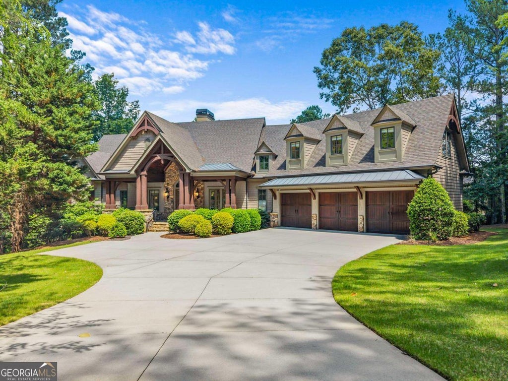 OWNER FINANCING AVAILABLE. Fully furnished, beautiful lake home nestled on almost two acres of property offering quality craftsmanship and details, steps from the boat dock with TWO ASSIGNED BOAT SLIPS. Designed to elevate your lifestyle , this home features 6 bedrooms, 6 full baths, and 2 half baths, and is ideal for both luxurious everyday living and memorable entertaining. The main level welcomes you with an expansive open floor plan, adorned with hardwood floors, wood beams and custom millwork throughout. A striking stone gas fireplace anchors the great room, while the formal dining area and open large kitchen create a space that is as functional as it is beautiful. The kitchen boasts an extra-large island, WOLF stove and ovens, a Sub-Zero refrigerator, and a bar area. Adjacent to the kitchen is a keeping room and a secondary dining area which opens to a spacious outdoor deck. The main level features a luxurious primary suite with a spa-like bath that includes heated floors and dual walk-in closets. A second bedroom with a full ensuite bath is also on the main level for convenience and comfort of visiting family and friends. Above the garage, a large private guest suite provides a tranquil retreat with a generously sized bedroom and full bath. Ascend to the terrace level via elevator designed for entertainment, offering an expansive family and game room, a full bar and a climate-controlled walk-in wine cellar that holds approximately 1,500 bottles. Three additional large suites each with private baths, and an additional half bath complete this level. Step outside to the covered stone patio, which overlooks the lake, perfect for outdoor gatherings and relaxation. This exceptional home is a rare find with almost two acres providing privacy and future opportunities for a pool, outdoor kitchen and even a pool house. There is a nature walking trail in the beautiful backyard. Located near Reynolds' main entrance, shopping center, hospital, the Ritz Carlton and other community amenities, this home is move-in ready. Membership is available.