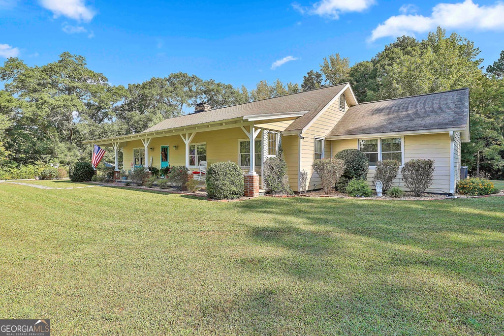 Set on four peaceful acres in Fayetteville, this beautifully updated 1960s farmhouse blends timeless charm with modern comfort. A winding, tree-lined driveway leads you to an expansive rocking-chair front porch and a screened side porch with a classic brick water table-perfect spots to savor quiet mornings or relaxed evenings. Though only 10 minutes from I-85 exit 61 and just 20 minutes to Hartsfield Int'l Airport, the property feels miles away from the bustle of daily life. Inside, the sense of home is immediate. Original hardwood floors, vintage doors with period hardware, and touches of shiplap, beadboard, and custom ceilings honor the home's history, while thoughtful updates provide everyday convenience. The front entry opens to a welcoming living room anchored by a stone masonry fireplace with built-in wood storage. The newly remodeled kitchen pairs custom cabinetry with rain-glass upper doors, leathered granite counters, a farmhouse sink, and a breakfast bar with butcher block top. Stainless appliances, a decorative tile backsplash, and a built-in wine rack complete this gathering space. The kitchen flows easily into a spacious dining area for formal or informal meals where family and friends can gather. Down the hallway, the primary suite features a shiplap accent wall, dual closets, and a reconfigured bath with a large walk-in shower and a private water closet with sink vanity. Three additional bedrooms-one currently used as a home office-offer generous closet space and share a stylishly updated guest bath with a wood-look tile floor, decorative sink vanity, and ceramic tub/shower surround. Just off the kitchen and with a rear entry to the carport, is an informal foyer with shiplap walls that provides a large drop zone with bench seating, dual storage closets, and hooks for coats, hats, etc. with shelving above. Beyond this space, a flexible bonus room invites you to create the perfect game room, studio, or additional family gathering area, and a fixed staircase offers access to abundant floored attic storage. On the opposite side of the back foyer, a sliding barn door opens to a spacious mudroom that includes laundry facilities, pantry shelving, and room for an extra refrigerator or freezer. A full bath with an oversized tiled shower with toilet and sink vanity completes this side of the home. Outdoor living is equally appealing. With the mostly grassy 4 acres, the property could easily be fenced to house a horse or two. A two-car carport adjoins a small shed that houses a large storage tank for well water used in outdoor watering. The fenced area just to the back of the carport and adjacent to the house is ideal for pets, play, or a garden, and the circular drive leads to a 30' x 30' workshop with electricity and an open covered area to the rear that is of pole-barn construction. Situated near the upcoming Arthur M. Blank U.S. Soccer National Training Center, Trilith Studios, and the vibrant Town of Trilith, this property offers a rare combination of privacy and accessibility. With its mix of original character and thoughtful renovations, this Fayetteville farmhouse is more than a house-it's a place to feel at home.
