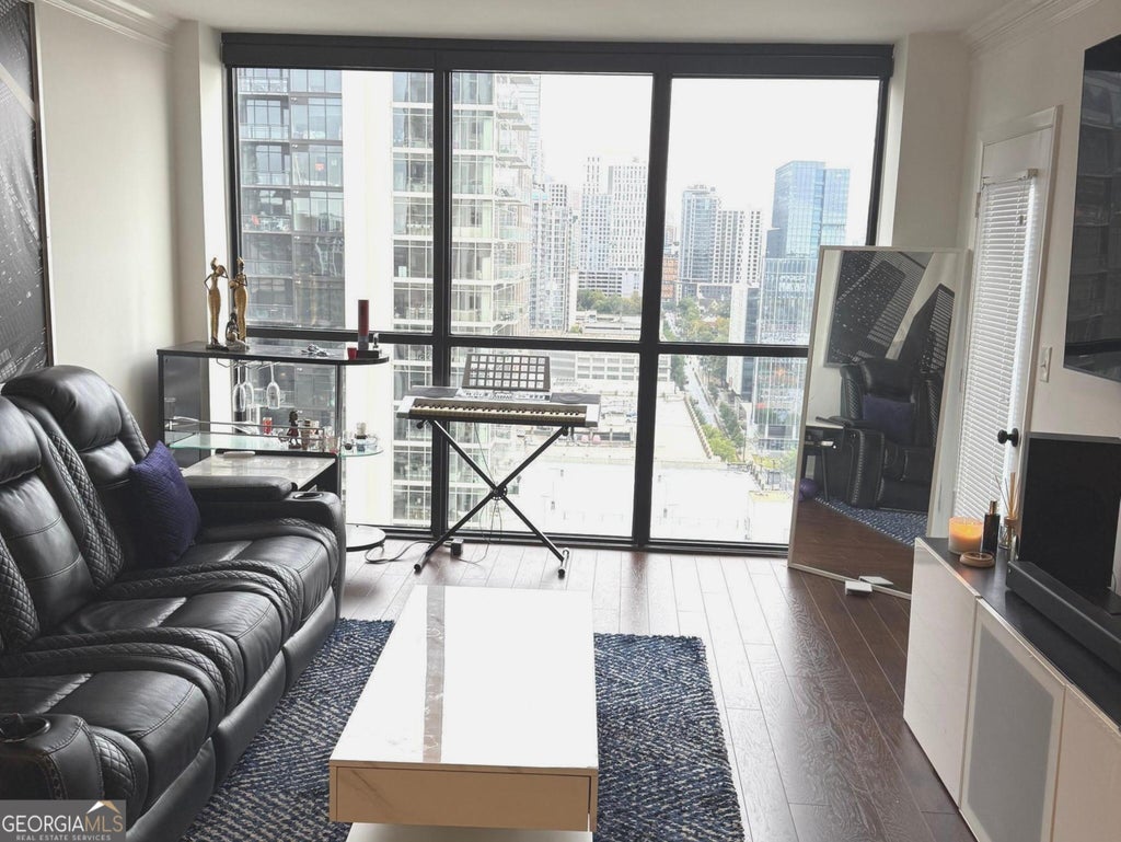 Awesome 28th Floor 2 bedroom 2bath condo overlooking the heart of Midtown Atlanta! This condo boasts beautiful scenic views from every room in this space from its ceiling to floor windows. It all starts with an inviting entry into an intimate foyer that leads to the main attraction which starts with a kitchen thats equipped with granite counter tops, stained cabinetry, ceramic flooring, and a pass-thru window, making it easy to connect with family and guest. Not to mention, still be able to take in the beautiful views in the living room! The living room is adorned with hardwoods floors, large picturesque view of the city and an entrance out onto the balcony for further exposure. Topped with all of this, comes a master bedroom with an oversized walk in closet for all your fashion essentials. Oh, let's not forget.. your very own private balcony entrance! Lastly, a secondary bedroom on the opposite side offering up hardwood floors, private full bath and another room with a view. In addition, the common areas includes a swimming pool, tennis courts, meeting areas, billiard room, fitness center, concierge and more.. A Must See gem in the heart of Midtown, its Lifestyle and Convenience at its Best!