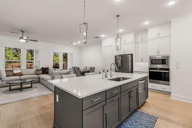 Live in a prime location close to everything. This beautiful 2 story Canterfield plan in an award-winning community by David Weekley lives like a single-family home. Harper Dr. is in the back of the community with no road noise. As you enter the front door into the foyer, you will see how wide the home is and how ample the space is for the living, dining, and kitchen spaces. This home is meant for entertaining! Picture your family and friends interacting with you and each other in the fantastic living space. The white kitchen cabinets are a great contrast to the darker wood island base and white quartz top. The upgraded backsplash was added after purchase. You'll enjoy tons of cabinet and counter space, designer hood with a gas cooktop and stainless appliances. Through the back door, you will enjoy the spacious covered back patio overlooking a nice sized fenced backyard, rare in many townhome communities, and perfect for your four-legged friends! You can even enjoy hearing the church bells that ring every hour from the church across the street! As you climb the wide staircase, you will see the large landing, which is great for art display, an office, or a sitting area. To the right you will find two nice guest rooms and the guest bath with tile flooring and quartz countertops. Across the landing, you will enter your oasis. This oversized primary bedroom has plenty of room for all your king-sized furniture and across from the bed area, put a comfy sitting area with the tv mounted there. The primary bathroom features updated tile floor, quartz countertops, a beautiful soaking tub and a large tiled shower. What a great place for you to retreat! Another nice addition is the screened porch off of the primary bedroom. Set up your wine fridge up there and relax after the end of the day! The laundry room is on the second floor. This community has a great pool area, great neighbors who all walk their dogs, and talk. The dog park is perfect for letting your pets release energy and best of all, this location is only 2 miles from downtown Roswell and 2.5 miles from Downtown Alpharetta! Get in now. You will love this way of living!