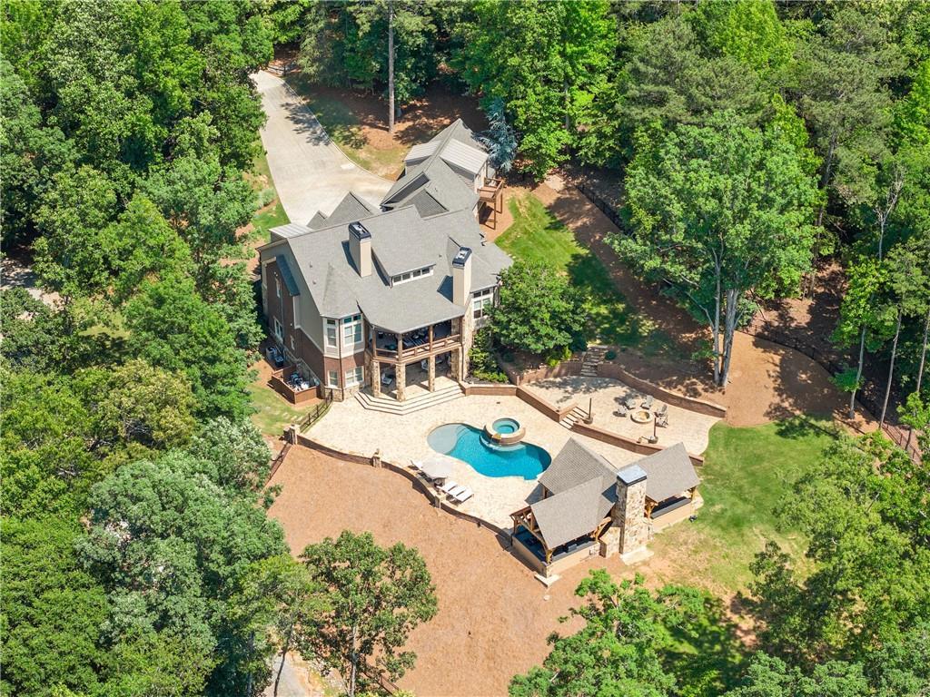 Tucked behind a private gate on over 4 lush acres with a double-slip dock on deep water, this property offers a rare lakefront estate where refined living meets timeless charm. This custom craftsman home is designed for those who value privacy, beauty, and effortless entertaining. Inside, rustic warmth meets polished sophistication—beamed ceilings, a dramatic two-story great room wrapped in glass, and a commanding stone fireplace create a sense of arrival. The designer kitchen stuns with high-end appliances, a lake-hued vent hood, and an oversized island that anchors the open-concept main level. A cozy breakfast nook doubles as a quiet workspace, while the dining area flows seamlessly for intimate dinners or celebratory gatherings. The primary suite is a private sanctuary, complete with double tray ceilings, dual custom closets, and a sunlit spa bath featuring terrazzo finishes, a soaking tub, and an expansive walk-in shower with rain and body sprays. Upstairs, a self-contained guest suite—with its own kitchen, living room, and full bath—offers ideal separation for visitors or extended stays. The terrace level was made for entertaining: a third full kitchen, media and game spaces, and three additional bedrooms complete the experience. Outdoors, the estate unfolds into a private resort. Covered porches and fireplaces overlook a free-form, heated, gunite pool with fountains, tanning ledge, and spa—all centered around a handcrafted Amish pavilion with a full outdoor kitchen, buffet bar, firepit, and café lighting. The adjoining 11.34-acre parcel is available for purchase. The additional acreage includes a second single-slip dock and a large barn, adding versatility and storage—think RV, boat, or future guest quarters—creating the rare opportunity to own a 15.67-acre waterfront compound: listing #7587736 for more info.