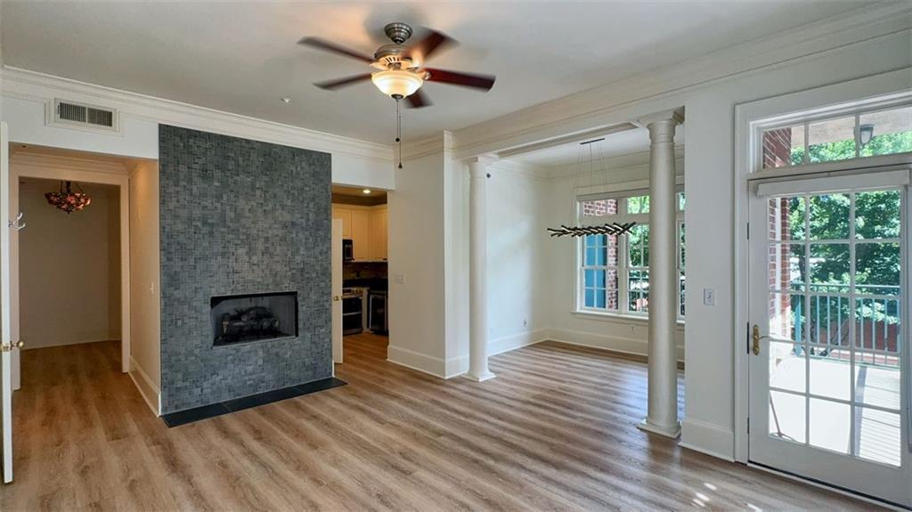 Here’s your opportunity to own one of the most desirable corner units at Cotting Court, an iconic brick residence just steps from Peachtree Street. This boutique mid-rise offers luxury amenities including a 24-hour concierge, fitness center, lap pool, secure garage parking, and private balconies. Flooded with natural light, this rare corner home features expansive windows and rich LVP floors throughout the main living areas. The open-concept layout is anchored by a cozy gas fireplace, while the adjacent dining area includes remote-controlled lighting for added ambiance. The kitchen blends style and function with custom white cabinetry, stainless steel appliances, and a designer tile backsplash. The spacious primary suite includes a walk-in closet and a luxurious en-suite bath with double vanities, a soaking tub, and a separate tiled shower. A stylish, space-saving guest bath adds to the unit’s smart design and urban appeal. Step outside to your private balcony or take advantage of the many perks this unit offers, including trash disposal just down the hall, convenient stair access for pet owners or joggers, and a sixth-floor resident patio with skyline views. Cotting Court’s prime location puts you near Piedmont Park, the Beltline, The Fox Theatre, Publix, Whole Foods, Georgia Tech, and Midtown’s top dining. Bonus: Cotting Court has made its mark on the silver screen, featured in productions like Marvel’s Ms. Marvel, Shazam, and The Amazing Race, a nod to its cinematic charm and historic surroundings near the Margaret Mitchell House.