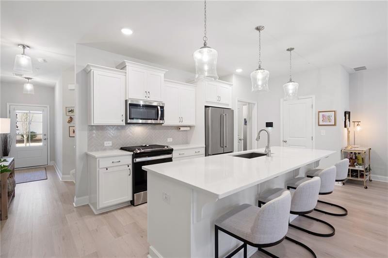 Nearly brand new townhome on one of the best lots overlooking trees - no homes behind this one. Over $15k in upgrades by owner (Security System Installed, Custom Built Closets, Window Screens in all windows along with built in shades, and new refrigerator.) Easy living with main-level garage. This open concept plan features high-end luxury vinyl flooring, crown molding, neutral paint and a sleek design. Oversized Primary Suite includes a sitting area, a luxurious bathroom with double vanity, and NEW walk-in Custom Built closet. 2 additional bedrooms (New Custom Built Closet in 2nd bedroom as well), 1 full bath, and the spacious laundry room complete the upper level. Patio opens to grassy area that can be fenced in - ideal for pets, entertaining or privacy. High Parc at Smyrna is only a few minutes or even walking distance from Ruby's Pizza! And, easily accessible to so many great areas - Smyrna Market Village with the local favorite Farmer's Market and the anticipated StillFire Brewery, Vinings, Buckhead, Midtown, Downtown, Braves stadium and the Battery. Pool in the community just a few steps away. Low HOA fees.