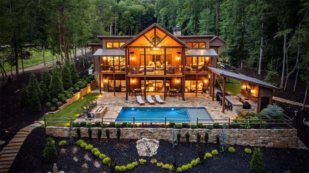 Presenting The CreekFront Lodge-an exceptional 4-bedroom, 3.5-bath custom residence by Lomonaco Homes on just over two acres with approximately 300 ft. of Fightingtown Creek frontage, proudly showcased in the Parade of Homes. Curb appeal is immediate: an oversized three-car garage and professionally landscaped grounds with precision stonework set the tone for quality throughout. Designed for everyday living and effortless entertaining, the main level features an expansive open floor plan beneath vaulted ceilings with exposed timber beams. A floor-to-ceiling stone fireplace anchors the great room, while the adjacent chef's kitchen offers granite countertops, high-end stainless appliances, a walk-in pantry, and a large center island that flows to a bright dining alcove. A well-placed butler's pantry adds valuable prep and storage, and a main-level laundry room enhances convenience. The primary suite on the main provides a private retreat with a large walk-in closet and a spa-inspired ensuite highlighted by dual vanities and an oversized glass-enclosed shower; secondary baths echo the same elevated finishes for a cohesive look. The terrace level expands flexibility with a dedicated theatre room, a spacious recreation area with wet bar, and three additional bedrooms-one ensuite and two sharing a full bath-ideal for guests or multi-generational living. Outdoor living shines: expansive decks overlook the creek and step down to an outdoor oasis featuring a sparkling pool, a linear fireplace, and a fully outfitted pool house complete with full kitchen and bar for seamless indoor-outdoor gatherings. Professionally crafted hardscaping guides you to a creekside firepit for relaxed evenings by the water. Minutes to downtown Blue Ridge-shops, dining, vineyards and breweries, Mercier Orchards, the Toccoa River, and miles of hiking and biking trails-this property blends resort-style amenities with mountain-town convenience. Request the full upgrade list and schedule your tour!