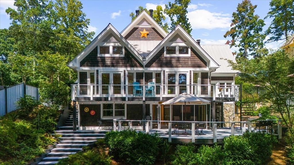 Who wants to live on the south-end of the lake that is about as close to Atlanta as you can get? Have you been searching for 'the perfect' lake home that you would LOVE everytime you walk in the front door and would be proud to entertain family and guests? This isn't just a home, it is a super-unique, fully renovated sanctuary that blends rustic charm with modern luxury, year round views of the lake and an easy walk to the dock. With over $250,000 in renovations in the past 3 years, the sellers have lovingly updated and maintained the entire home, from top to bottom. From the moment you arrive, you'll be amazed by the beautiful character of the wood shingle exterior and the elegant presence of the metal roof. Once inside, the heart pine flooring, custom built-ins, mantles and trim, designed from reclaimed barnwood, beamed ceilings and 3 cozy fireplaces makes this the perfect home to enjoy all 4 seasons. The gourmet kitchen is a chef's dream with high end appliances and an eat-in area that opens directly onto the deck. There is a charming wet bar/coffee bar with an additional full refrigerator that ensures you will always be ready to entertain, whether you are serving morning brews or evening cocktails. The main level primary suite is like a private oasis, complete with a fireplace, a spa-like bath and huge, custom closet will make you feel like you're in a high-end boutique. This impressive multi-level home has a gorgeous suite on the upper level and an equally impressive suite on the lower level. The lower level flex room is perfect for a bunk room, exercise room or a 2nd home office. Do you work from home? The bright, large office on the main level is the perfect area to get a bit of work done before heading out on the lake, and overlooks the koi pond. The open dining room blends with the great room and makes this a great area for conversation and entertaining. Step outside to the massive deck to enjoy the great outdoors or head down to the newly built screened porch on the lower level. There are so many interesting areas to spend time with a group or get away from it all in a quieter area of the home. The massive, cleared side lot is a highly sought-after bonus, offering a blank canvas for a future 2 car garage, home expansion or simply providing ample parking for a boat, trailer or RV. Stroll down to the lake, with beautiful water and new riprap at the shoreline for erosion control, to your dock with a party deck and boat lift. Take off in your boat to explore the marinas with lakeside dining or having a blast at Margaritaville at Lake Lanier Islands, all just a short boat ride away. This more than just a home, it's an invitation to a life of fun, luxury and serenity on Lake Lanier!