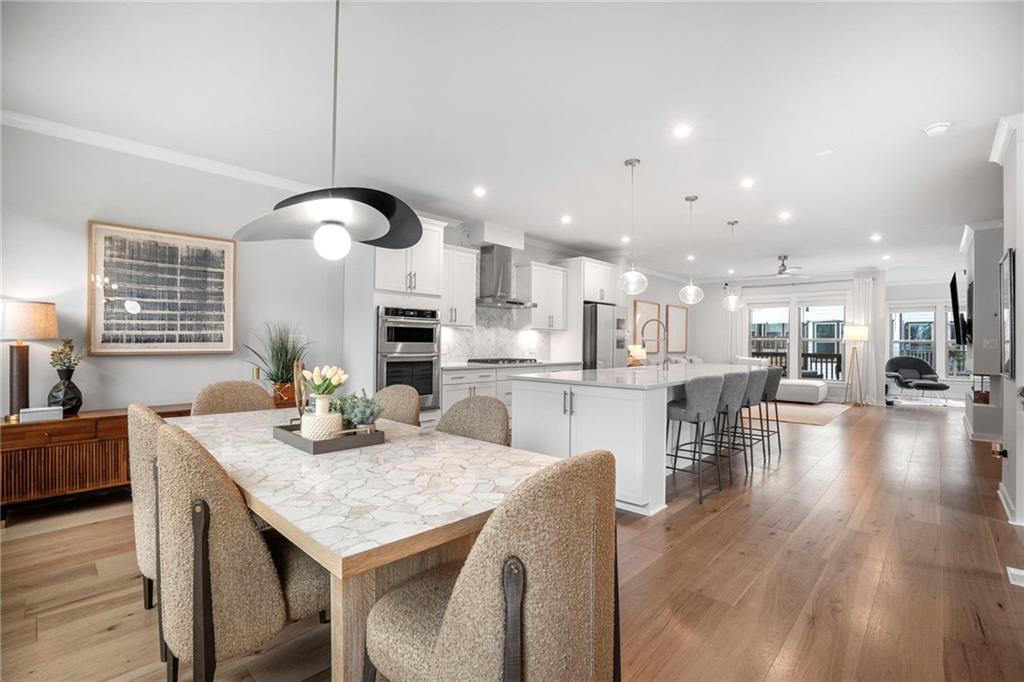 Step inside to an inspired blend of sophistication and warmth. Wide-plank hardwood floors and custom architectural detailing set a tone of effortless elegance. Each space has been thoughtfully designed with bespoke accent walls and designer lighting that add harmony and personality throughout. The living room invites relaxation around a striking built-in electric fireplace — a perfect blend of modern artistry and cozy comfort in one striking focal point.